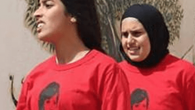 Girls wear shirts with the image of Palestinian terrorist Dalal Mughrabi at a sports event named after her. Credit: PMW