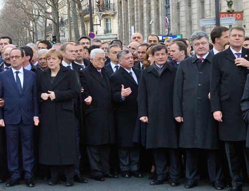 Palestinian Authority President Mahmoud Abbas—third from left in the front row, sandwiched between German Chancellor Angela Merkel and Jordan’s King Abdullah at the Jan. 11 solidarity march against terrorism in Paris—condemned the attack on the French satirists at Charlie Hebdo, but recently jailed and tortured a Palestinian satirist. Credit: Haim Zach/GPO.