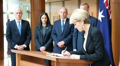 Prime Minister Malcolm Turnbull writes in the condolences book watched by President of the Senate, Senator Stephen Parry, Speaker of the House of Representatives Tony Smith, Foreign Minister Julie Bishop and Leader of the Opposition Bill Shorten.