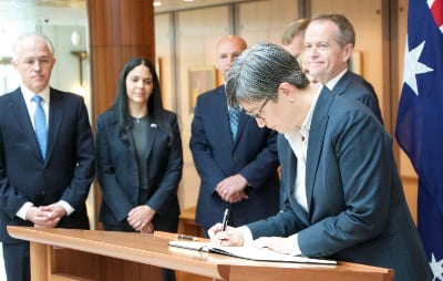 Shadow Attorney-General Mark Dreyfus, Labor Senator Glenn Sterle and Labor MP Michael Danby sign the book