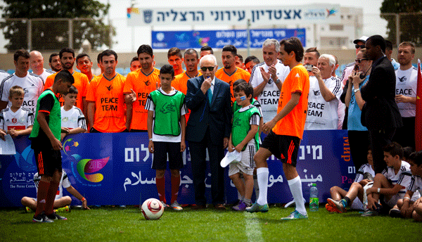 At a briefing in the locker room with the professional all-star players prior to the start of the event Peres said: “I am so happy that you have joined us in playing for peace. We must end the recent negativity occurring on the pitch. You come here today to not only play with your feet, but also with your soul.”