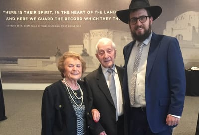 Survivors Cesia and Abe Goldberg with ACT Chabad Rabbi Shmueli Feldman