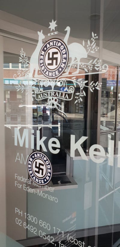 On Saturday, Sept 1st,Kelly’s Bega office had Antipodean Resistance swastikas stickers place on his office door, along with stickers on a “Bega Valley Welcomes Refugees” sign and a Council building.