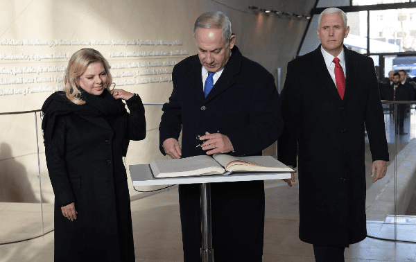 Israel’s Prime Minister Benjamin Netanyahu and his wife Sara, US Vice President Mike Pence and his wife Karen, and Polish Prime Minister Mateusz Morawiecki and his wife Iwona, laid wreaths at the Ghetto Heroes Monument commemorating the Warsaw Ghetto Uprising.