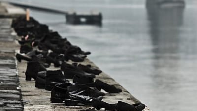“Shoes on the Danube Promenade” memorial to the Holocaust on the Danube River, erected in 2005. Credit: Nikodem Nijaki/Wikimedia Commons