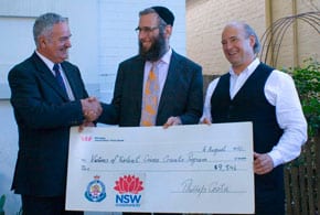 At a ceremony at Jewish House’s Bondi premises, the NSW Minister for Corrective Services, Phillip Costa, handed the the care organisation’s CEO Rabbi Mendel Kastel a cheque for almost $10,000. The ALP State member for Coogee, Paul Pearce was a willing helper at the handover.