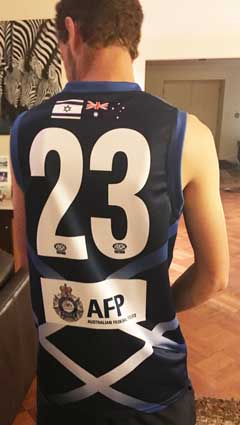 Jew Crew Team Manager, Ryan Kuperholz ran a private session this week with his players sporting their new individually designed footy guernsies proudly featuring a Magen David on the front and Israeli and Australian flags on the back.