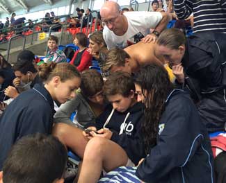 As Alon stood nervously behind the blocks about to compete in the 14yrs 100m freestyle sharing the tension, possibly as nervous as him, 1000kms away over 20 of his club-mates, crowded together to watch the action unfold live on their mobile phones.