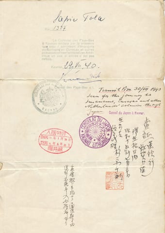 Transit visa baring the stamp of Sugihara. The document was issued to Mr Jakob Sapir, Mrs Tola Sapir and their four year old son Piotr- Seweryn Sapir in lieu of passports, allowing the family to travel safely through Japan. SJM Collection