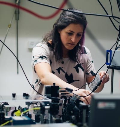 Graduate student Yifat Baruchi in Prof. Ronen Rapaport’s lab, testing a photon measurement setup, at the Hebrew University’s Quantum Information Science Center. (Credit: Yitz Woolf for Hebrew University)