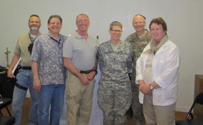 L-R U.S. officials Matt and Michael, Rob Getreu, Navy Lieutenant Commander Risa Simon, Colonel Michael Benjamin and U.S. Embassy official Dr Lowry Taylor