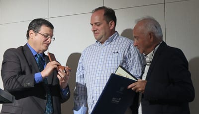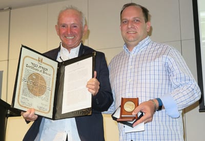 Israeli ambassador Shmuel Ben-Shmuel presents the medal to Kyle Joustra as Maarten Joustra watches Photo: Henry Benjamin/J-Wire