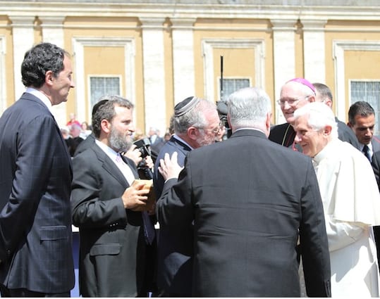 When the formal ceremony, lasting about two hours, ended, the Pope came off his dais and moved along the receiving line to greet us. Gary introduced me to the Pope warmly with my formal titles. I gave the Pope a special gift we had gotten for him. It was a beautiful dual-time Phillip Stein watch. The Pope lit up when he saw it and said, “Look, it has two faces on it,” which, as it happened, was the perfect introduction for me to share the issues I had prepared. I said, “Pope Benedict, it’s an honor to meet you. This watch has the times of Rome and Jerusalem on it, signifying the eternal friendship between our two faiths. I also hope that when you wear it the future of the Jew people will always be on your mind, as Israel struggles with existential threats, like Iran, who threaten to wipe it off the map. You’re voice against these threats is essential, your holiness.”