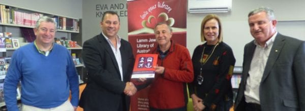 L-R Sean Nochomowitz (ZCV) Jeff Dimand (FBI Travel) Roy Schloss (prize winner), Leonie Fleiszig (Lamm Library) and Ian Samuel (chairman of information – ZCV)