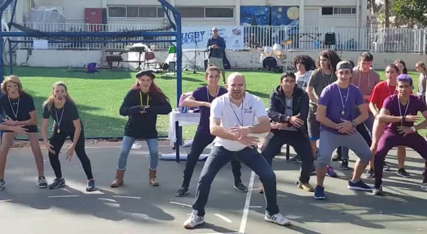 A carnival atmosphere prevailed with parades, an opening ceremony, balloons, flags, music played by the school band, songs and even a raffle. The Israel Rugby Union supported this unique venture by providing a cup, medals, rugby balls and tee shirts. Without a doubt one of the highlights was a spirited Haka led by Simon who has been a passionate All Black supporter since his school days back in New Zealand. In addition each team created their own haka and performed it to the delight of onlookers and participants alike. One of the most difficult tasks, according to Simon, was teaching the students the elementary rules of playing rugby. The concept of passing a ball backwards while running forward is very difficult especially for Israeli kids brought up on soccer and basketball. One of the parents who originally made Aliyah from South Africa and whose son at the school is part of the Israel rugby youth team assisted with training.