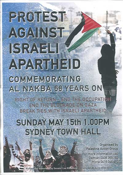 The Nakba day rally was held in Sydney at the Town Hall at which NSW Greens Senator Rhiannon addressed the small crowd saying “the great crime of the 20th century is now the great crime of the 21st century – that is the Nakba. It started in 1948, it’s the longest military occupation in history.”