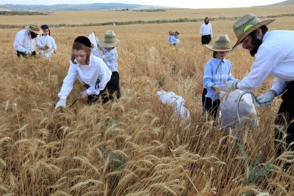 Ultra-Orthodox Jews follow an ancient Biblical command and harvest wheat with a hand sickle in a field near the central Israeli town of Modi’in. They will store the wheat for almost a year and then use it to grind flour to make unleavened bread for the week-long Passover festival. May 24, 2009. Photo by Nati Shohat/Flash90
