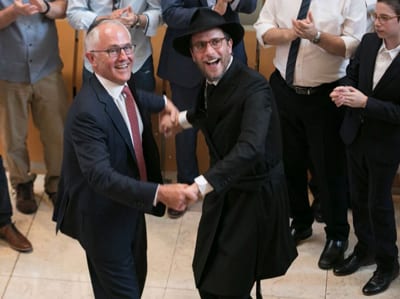 The Prime Minister Malcolm Turnbull dances with Rabbi Levi Wolff