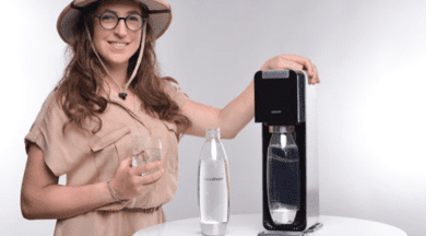 Mayim Bialik, star of the “Homoschlepiens” video campaign, with a SodaStream machine. Credit: SodaStream.