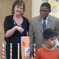 Ambassador Sisa Ngmonbane and BIS executive director Jean Judes light the menorah with Yoav, a child with intellectual disabilities