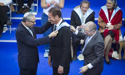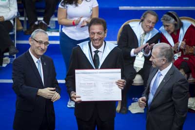 The President surprised the audience by joining fellow Honorary Doctorate recipient Miki Gavrielov to sing the popular Israeli song “Ani v’Attah” (“You and I Will Change the World”). The internationally acclaimed song, a collaboration between Gabrielov and the late Israeli musician Arik Einstein, was recorded over 40 years ago as an anthem celebrating youth and the promise to change the world.