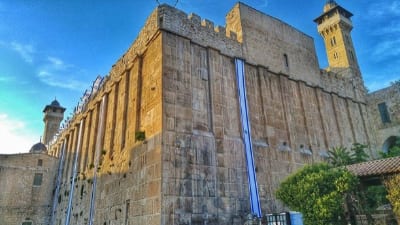 Israel flags decorate the 2,000-year-old Tomb of Machpelah complex in Hebron in anticipation of Yom Ha’atzmaut. The same Herodian masonry is used for the Western Wall in Jerusalem. Photo by Yishai Fleisher.