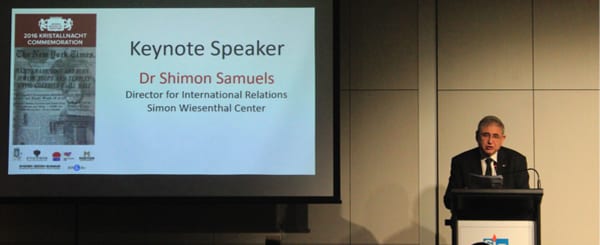 Speakers at the Kristallnacht commemoration spoke of the importance of remaining vigilant to intolerance, discrimination and hate speech, particularly as we have witnessed a resurgence in antisemitism. Keynote speaker, Dr Shimon Samuels, Director for International Relations of the Simon Wiesenthal Centre, referred to the 2001 World Conference Against Racism in Durban, when post-Holocaust antisemitism reared its ugly head. “The tiny Jewish Club in Durban was surrounded by demonstrators with the banners of Mein Kampf declaring Hitler was right, he didn’t finish the job”. Vandalism of Germany’s national Holocaust memorial, onto which swastikas were etched, was also shown at the Kristallnacht commemoration through a video presentation.