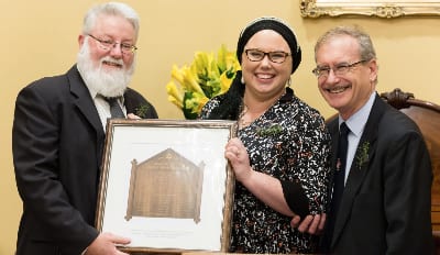 As a token of appreciation from the Hobart Hebrew Congregation, President Jordana Schmidt presented the Hobart City Council with a framed photograph of the newly dedicated ‘Roll of Honour of the Jewish Community of Tasmania’.