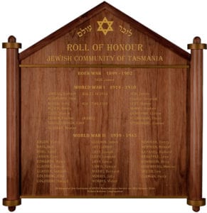 Senator Eric Abetz, representing the Minister Assisting the Prime Minister for the Centenary of Anzac, unveiled a splendid ‘Roll of Honour of the Jewish Community of Tasmania’, made from Tasmanian blackwood and inscribed with the names of 42 Tasmanian Jews who served in the Boer War, WWI and WWII – a project largely funded by a Department of Veterans Affairs’ Anzac Centenary Local Grant and endorsed by Andrew Wilkie, MP for Denison. Rabbi Yochanan Gordon of Chabad Tasmania (Launceston) recited a blessing to dedicate the new addition to the Hobart Synagogue.