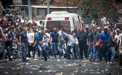 Palestinian rioters in eastern Jerusalem, near the Old City, protest Israel’s new Temple Mount metal detectors following Friday prayers July 21, 2017. Credit. Yonatan Sindel/Flash90