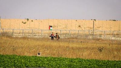 File photo: Palestinians wave a flag near the border fence east of Kahn Yunis in the southern Gaza Strip, on May 19, 2017. Photo by Abed Rahim Khatib/ Flash90