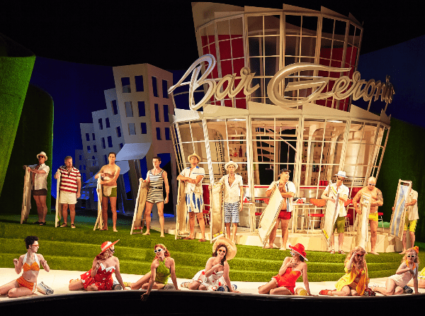 For Phillips an overture is a lot more than music and he sets the mood beautifully with a parade of beachgoing belles in their 50s swimmers, followed by the guys in their just as humorous outfits. Their struggles to set up the beach chairs was beautifully choreographed and at the same time made audience members reminisce about their own struggles with these at times confounding pieces of wood and canvas. Great creativity by Gabriela Tylesova, who is also responsible for the wonderful set, replete with those chrome and red vinyl stools those old enough remember so well.