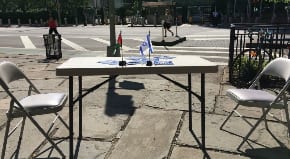 World Jewish Congress sets up symbolic ‘negotiations table’ outside of the UN headquarters in New York. June 29, 2017. (Courtesy: World Jewish Congress)