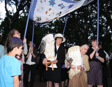 Gloria Goldstein and Louise Rosenberg parade the Torahs