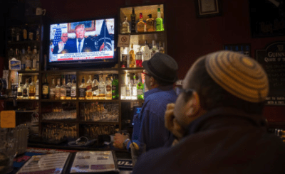 Israelis at a pub in Jerusalem watch a broadcast of President Donald Trump’s Dec. 6 announcement on U.S. policy towards Israel’s capital. Credit: Yonatan Sindel/Flash90.