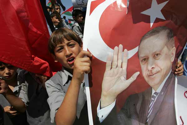 In Gaza City on Sept. 13, 2011, Palestinian students hold up pictures of then Turkish prime minister and now President Recep Tayyip Erdogan during a rally that urged Erdogan to visit the Hamas-ruled Gaza Strip. Erdogan’s pro-Palestinian and anti-Israel views have been increasingly on display in recent years. Credit: Abed Rahim Khatib/Flash 90.