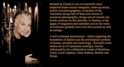 De Chazal is described on his web page as “one of Australia’s most respected haute-couture designers, make-up artists, stylists and photographer. A member of the Australian design hall of fame and winner of numerous photographic, design and art awards.