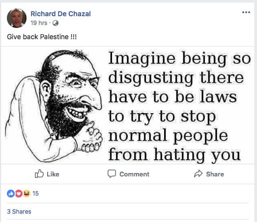 Richard De Chazal has posted an image on his Facebook stating that there are laws to stop hating “you” supported by a caricature of a Jew accompanied by the words “Give back Palestine”.