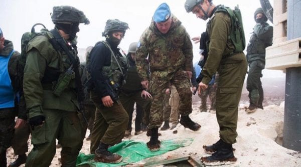 The head of the IDF’s Northern Command, Maj. Gen. Yoel Strik, met with the UNIFIL Cmdr. Gen. Stefano Del Col from Italy and toured the area of the cross-border attack tunnel that was exposed after being dug from Lebanon into Israel. Dec. 6, 2018. Credit: IDF Spokesperson Unit.