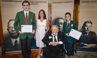 Ninety-year-old Auschwitz survivor Paul Seideman was present to meet the two winners of the competition he has endowed, for secondary school students to write an essay on a Holocaust topic.
