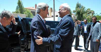U.S. Secretary of State John Kerry is greeted by Saeb Erekat, chief negotiator for the Palestinian Authority in the eventually collapsed American-brokered Israel-Palestinian peace talks, before a meeting in Amman, Jordan, on June 28, 2013.