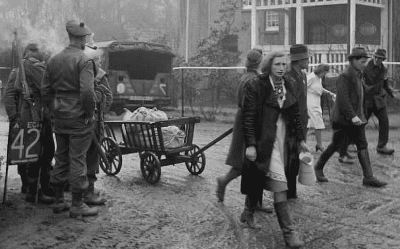 Scottish troops watch as German refugees stream back through the village of Bedburg near Kleve, Feb. 19, 1945. Credit: Imperial War Museum, London, part of the War Office Second World War Official Collection.
