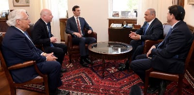 U.S. Ambassador to Israel David Friedman, Special Middle East envoy Jason Greenblatt, White House adviser Jared Kushner, Israeli Prime Minister Benjamin Netanyahu and Israeli Ambassador to the United States Ron Dermer, meeting in Jerusalem on June 22, 2018. Credit: U.S. Embassy in Israel.