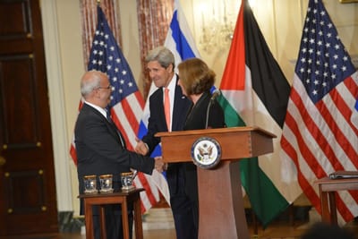 U.S. Secretary of State John Kerry (center), Israeli Justice Minister Tzipi Livni (right) and Palestinian chief negotiator Saeb Erekat shake hands after addressing reporters on the subject of Israeli-Palestinian peace talks at the U.S. Department of State in Washington, D.C., in July 2013.
