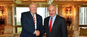 Donald Trump (left) shakes hands with Israeli Prime Minister Benjamin Netanyahu during their meeting at Trump Tower in New York City in September 2016. Credit: Kobi Gideon/GPO.