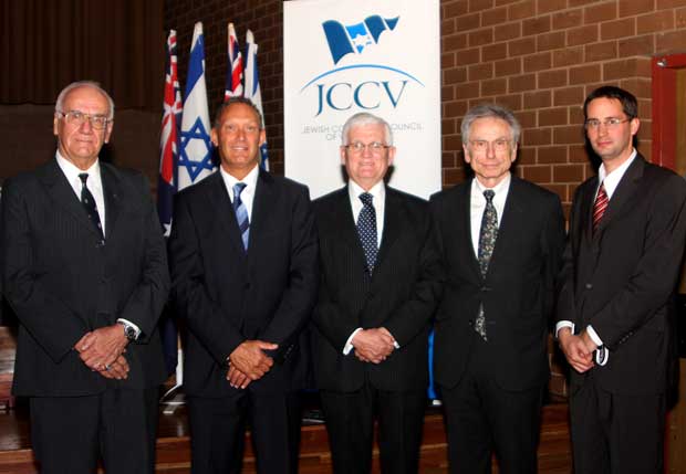 L-R, Dr George Luk Consul-General of Poland, Mr John Searle JCCV President, Mr Antun Babic Consul-General of Croatia, Mr Peter Brosc, Germany’s Deputy Consul, Mr Dor Shapira Embassy of Israel
