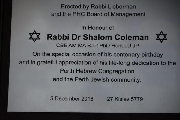Rabbi Dr Shalom Coleman has celebrated his 100th birthday in Perth last week.