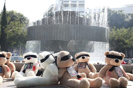 Teddy bears in Tel Aviv’s “Hostage Square” on Oct. 25, 2023, placed in solidarity with Israelis held captive by Hamas in Gaza. Photo by Gideon Markowicz/TPS