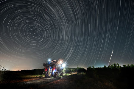 Star trails dance over the vineyards of Moshav Ramat Magshimim in the Golan Heights during the grape harvest on Aug. 14, 2023. Photo by Yehuda Weinberg/TPS