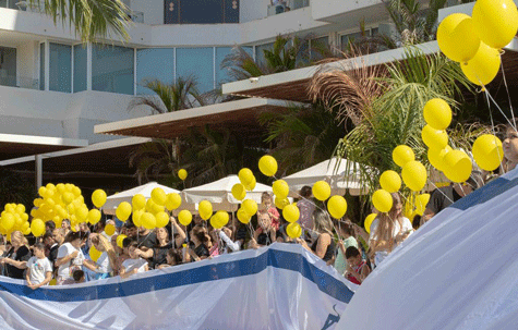 Kibbutz Nirim residents who were evacuated to Eilat release yellow balloons in solidarity with Israeli hostages on Nov. 4, 2023. Photo by Adele Raemer/TPS